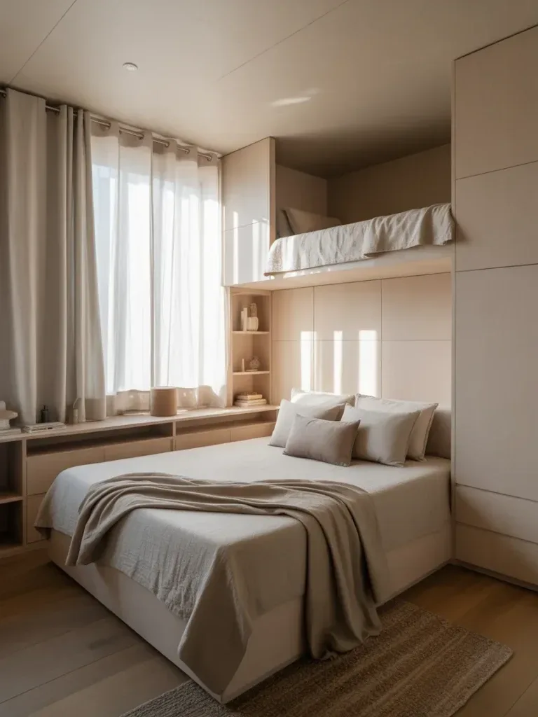 This one screams effortless style. Bright, airy, and ridiculously functional, it uses light to trick your room into feeling bigger. Natural materials keep things grounded. Nothing feels heavy or overwhelming.